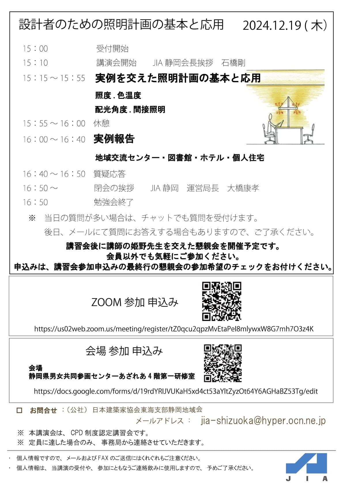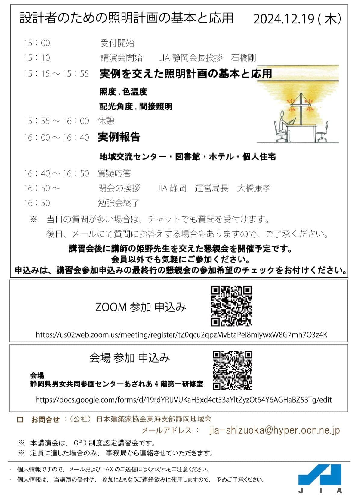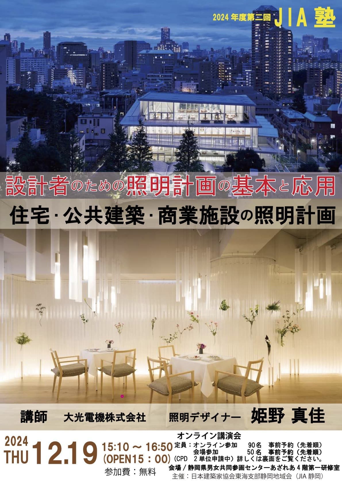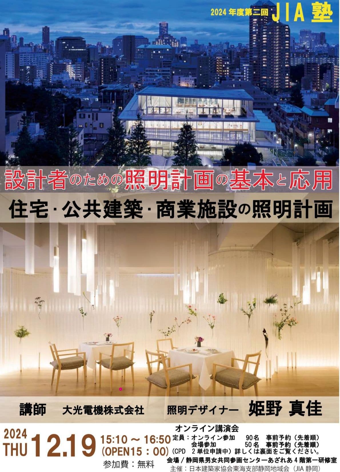 HOME | JIA塾 | JIA塾202402 第2回JIA塾 「設計者のための照明計画の基本と応用」 日 時:2024年12月19日(木曜日) 15:10~16:50(受付:15:00~) 定 員:オンライン 90名 会場 50名 場 所:静岡県男女共同参画センターあざれあ 4 階第一研修室/オンライン 参加費: 無料 講 師:大光電機株式会社 照明デザイナー 姫野 真佳 主 催:(公社)日本建築家協会東海支部静岡地域会 >>> 申込は、チラシ2枚目のQRコードでお願いします <<<