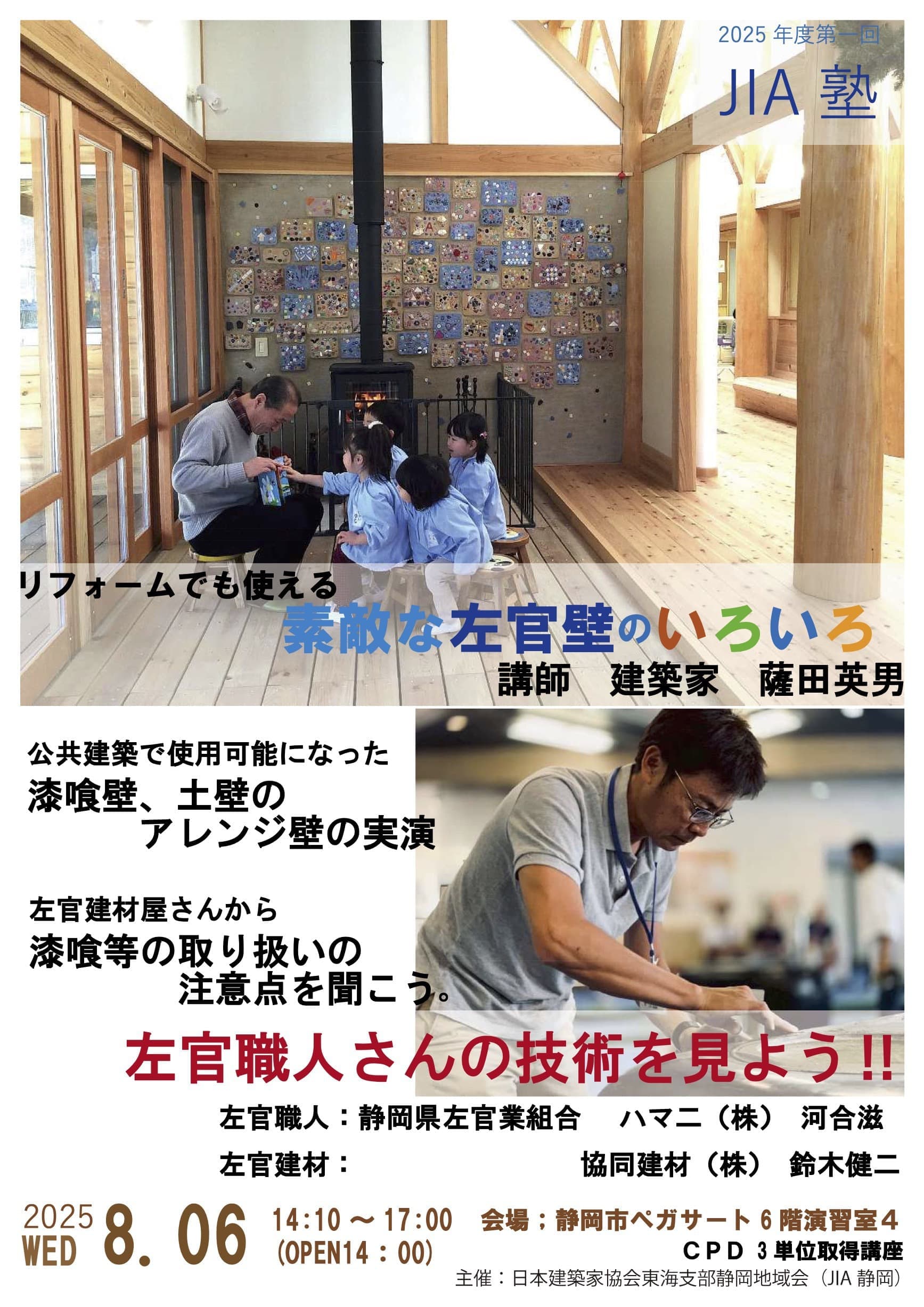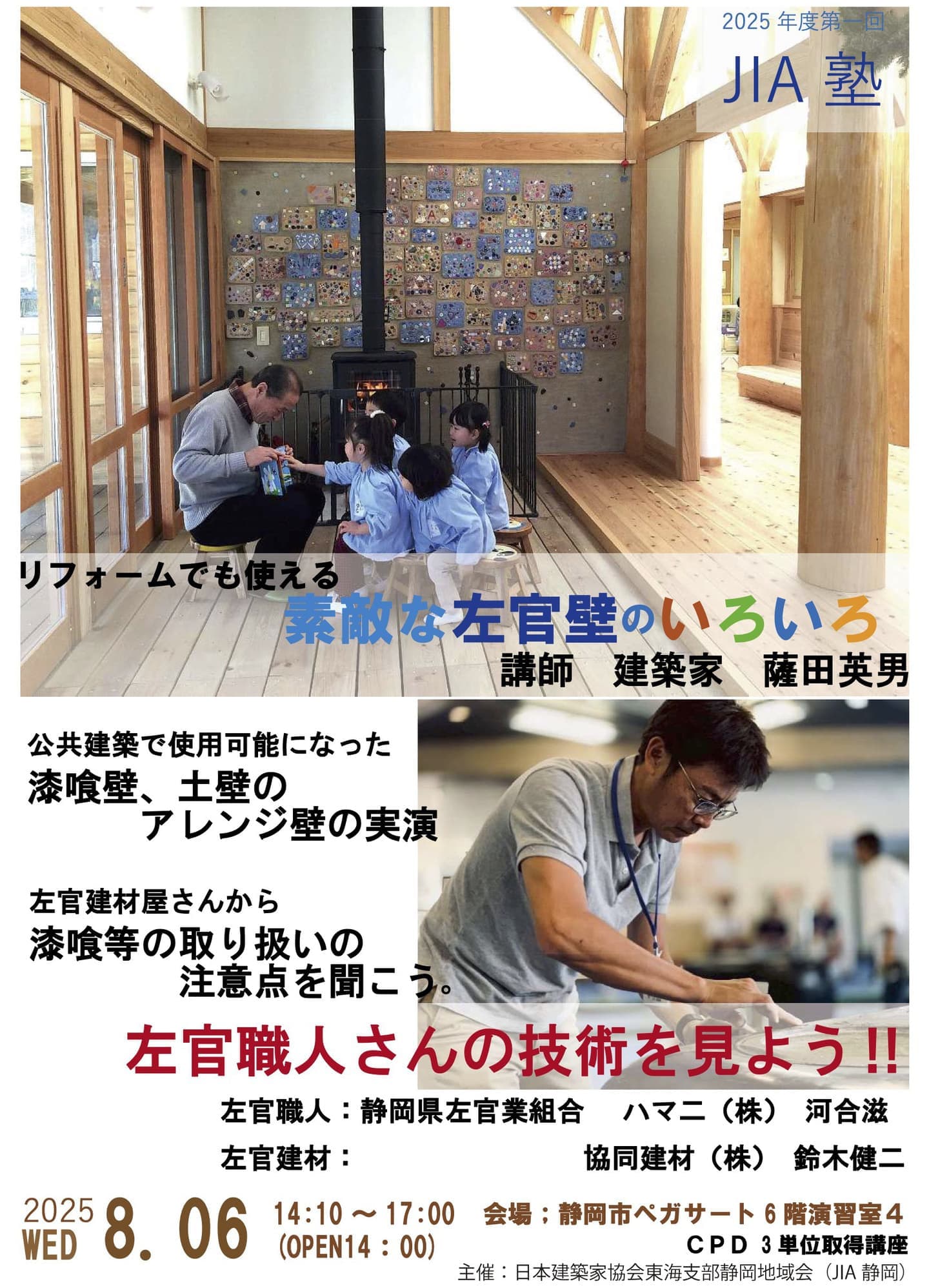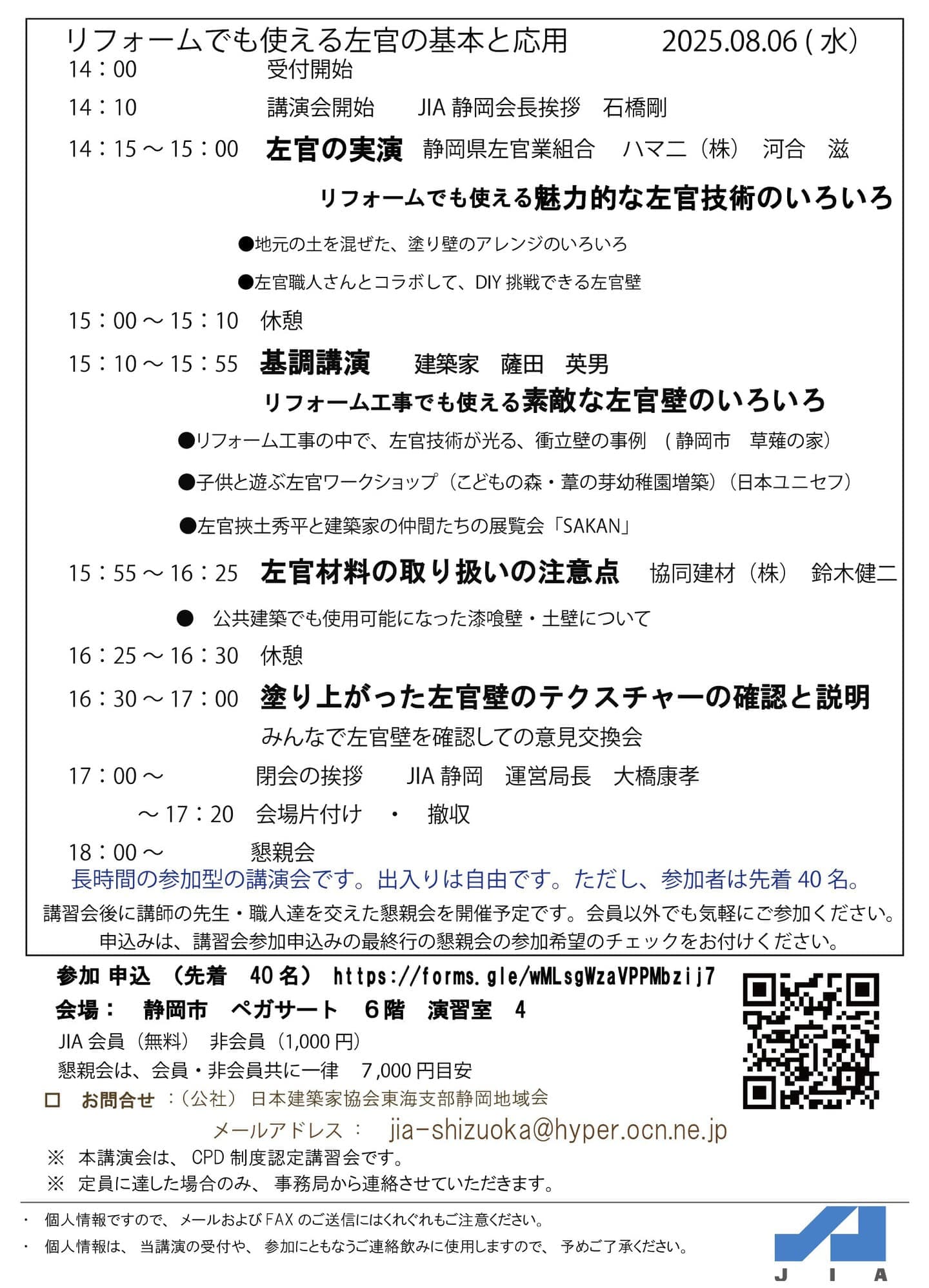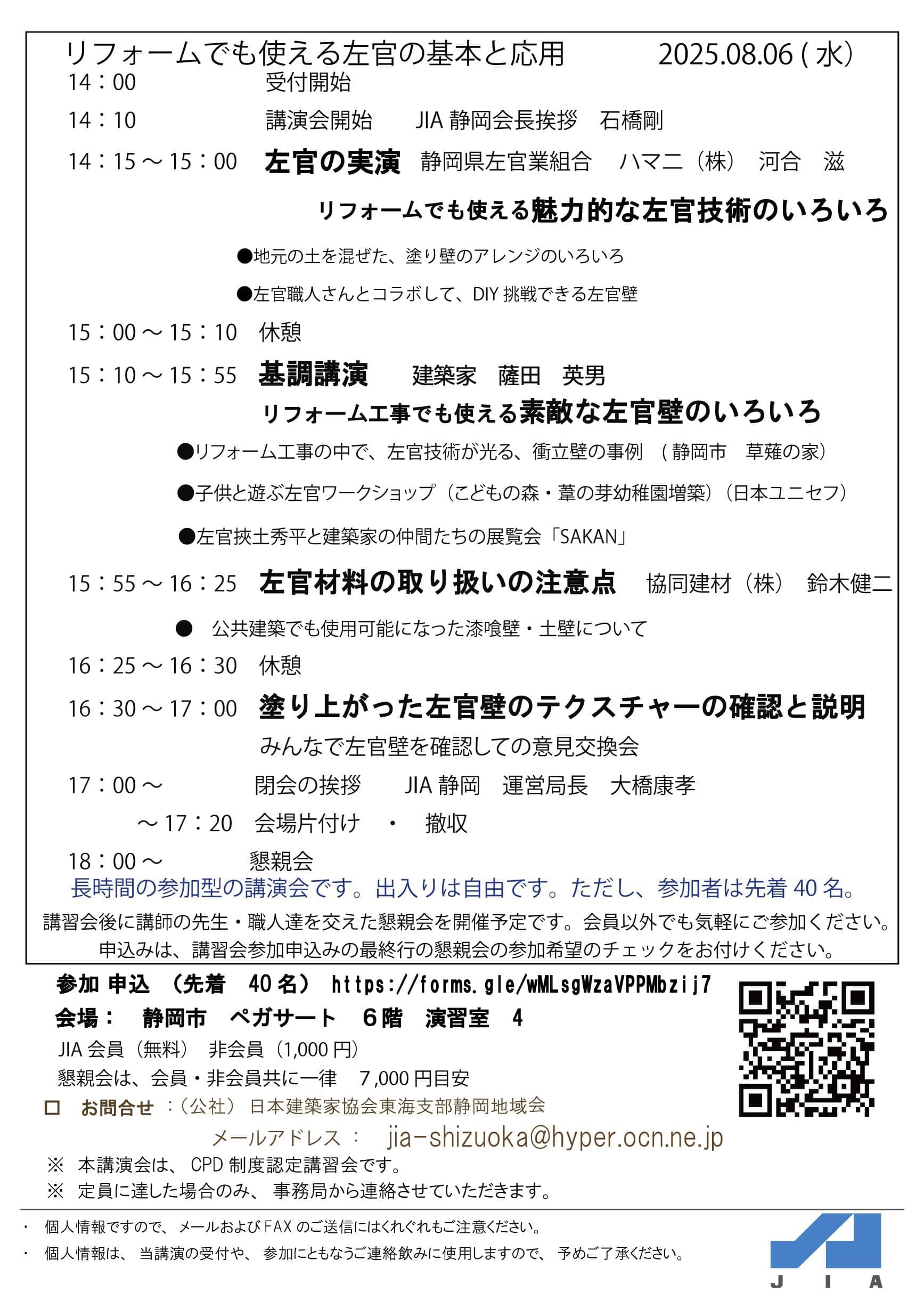 HOME | JIA塾 | JIA塾202502 第2回JIA塾 リフォームでも使える「素敵な左官壁のいろいろ」 左官職人さんの技術を見よう‼︎ 日 時:2025年8月6日(水曜日) 14:10~17:00(OPEN:14:00) 定 員:オンライン 90名 会場 50名 場 所:静岡市ペガサート6階演習室4 参加費: 無料 講 師:建築家 薩田英男 左官職人:静岡県左官業組合 ハマニ(株)河合滋 協同建材(株)鈴木健二 主 催:(公社)日本建築家協会東海支部静岡地域会 >>> 申込は、チラシ2枚目のQRコードでお願いします <<<
